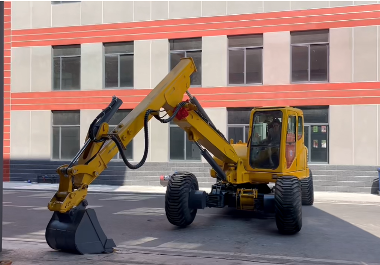 全地形挖掘機:區別于常規履帶式和輪胎式挖掘機,步履式挖掘機底盤克服了輪胎式的接地比壓大,爬坡能力弱和傳統履帶式不能再復雜地形工作的缺點。利用四條獨立多自由度的液壓支腿進行自由角度調整,補償地形凹凸高度差,實現在大角度傾斜地形行駛,行走,施工的目的。利用箱型伸縮工作臂與獨立多自由度的液壓支腿的配合作用,能攀登翻越較高的垂直障礙物。